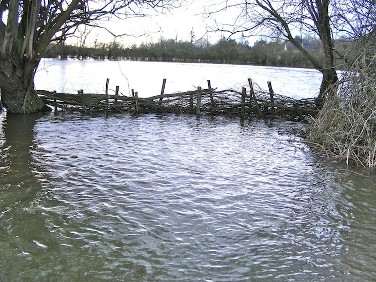 L'an dernier, les boeufs pâturant la prairie ont détruit la haie sur certains tronçons. Un obstacle artificiel a été reconstitué à l'aide de branches de saules, provoquant l'accumulation des débris entrainés par la crue et renforçant l'effet filtrant. Le dispositif est calqué sur le principe des haies de Benje.