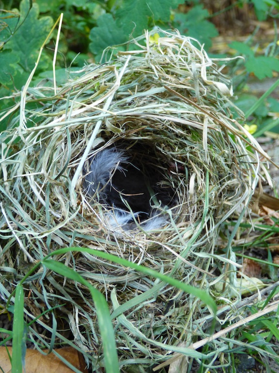 Sauf que : un pouillot véloce a en fait utilisé le foin de l'allée laissé au passage par la remorque, pour construire un nid tardif, qui plus est à 1,80 m de hauteur dans les pousses annuelles du charme!