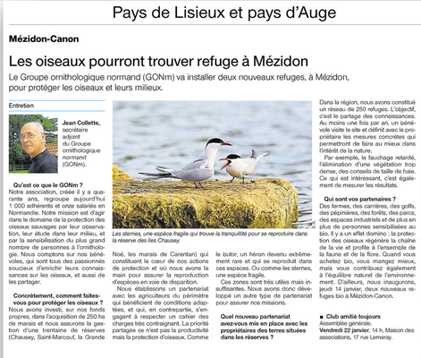 Cet article de Ouest-France anticipe la création de deux nouveaux refuges à Mézidon dans le Calvados et dispense quelques généralités sur le GONm. C'est l'occasion d'informer sur les actions de protection des oiseaux menées par le GONm à travers ses réserves et ses refuges.