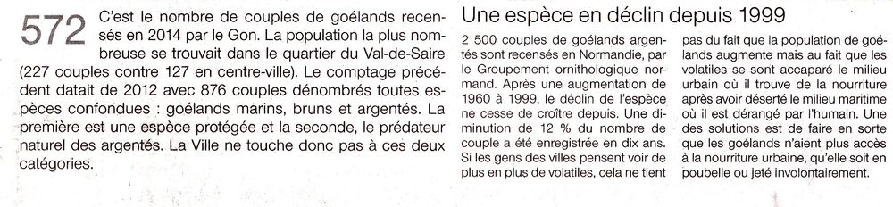 Cette année, avec cet air de printemps, la pression est plus précoce. L'article de Ouest-France ne crie pas haro sur le baudet et publie un article équilibré et documenté.Le GONm fournit une partie des informations. Comme il est dit dans cet article, alors que la mairie de Cherbourg envisage à nouveau la stérilisation des oeufs,la position du GONm ne varie pas . Le souci de précision du rédacteur ajoute deux encadrés livrant des informations chiffrées sur les populations de goélands et leur évolution à Cherbourg et en Normandie. Erreur : 2500 couples de goélands, c'est le nombre de couples perdus en dix ans en Normandie.