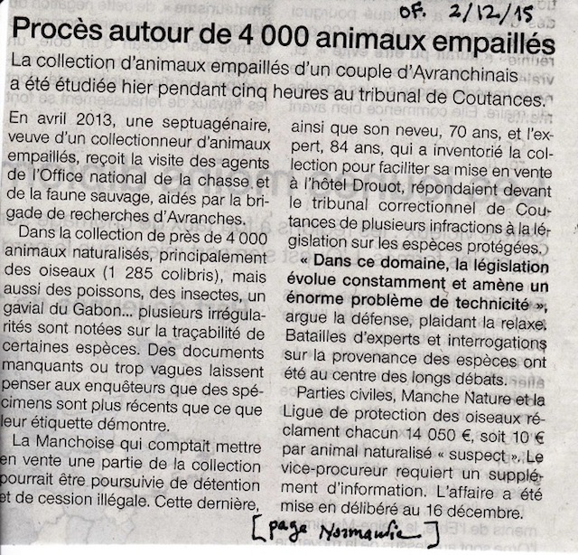 Le fait remarquable de cette affaire jugée au tribunal de Coutances, c'est l'âge des trois personnes concernées! Cette collection du 20e siècle est typique des dernières activités des collectionneurs de l'époque. Le propriétaire de cette collection, aujourd'hui décédé, est un chasseur fréquentant en particulier la baie du Mont Saint-Michel. Sa collection a démarré avant les lois sur la protection des espèces sauvages (c'est l'argument de la défense) , mais ses acquisitions se sont poursuivies plus tard à travers un réseau de relations de collectionneurs plus ou moins en règle. La DREAL et l'ONCFS traquent ces collections en marge de la réglementation, en particulier quand elles sont mises en vente publiquement comme ce fut le cas ici!