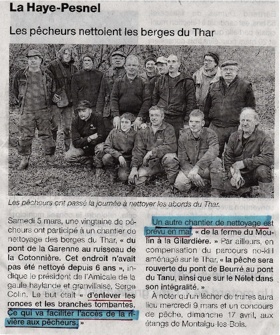 "Nettoyer" les berges des cours d'eau est une des actions "vertueuses" des sociétés de pêche, quand les naturalistes rêvent de rivières et de fleuves sauvages... Ici, il est clairement dit (du moins c'est ce que le journaliste a compris), le nettoyage "facilite l'accès de la rivière aux pêcheurs". Dont acte. Mais peu "écolo" comme justification! Mais le pire reste le choix des dates : " Un chantier de nettoyage est prévu en mai". Que les fauvettes et autres turdidés qui auront eu la mauvaise idée de construire leurs nids sur les rives du Thar entre la ferme du Moulin et la Gilardière ne soient pas surpris de voir leurs poussins grillés au feu de bois, ils auront été avertis par voie de presse!