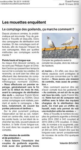 Les goélands urbains sont un sujet récurrent à chaque printemps. Autant donc faire de la pédagogie et expliquer les choses! Ici, il est question du comptage des goélands à Deauville et Trouville et des campagnes de stérilisation des goélands argentés. Bien sûr, il y a quelques inexactitudes : les trois goélands sont protégés mais il existe des dérogations pour l'argenté. Le rédacteur souligne bien la mission du GONm qui intervient à la demande des communes : protection des oiseaux et contrôle des opérations de stérilisation. Voilà un article de communication locale qui malgré quelques imprécisions informe correctement sur le sujet.
