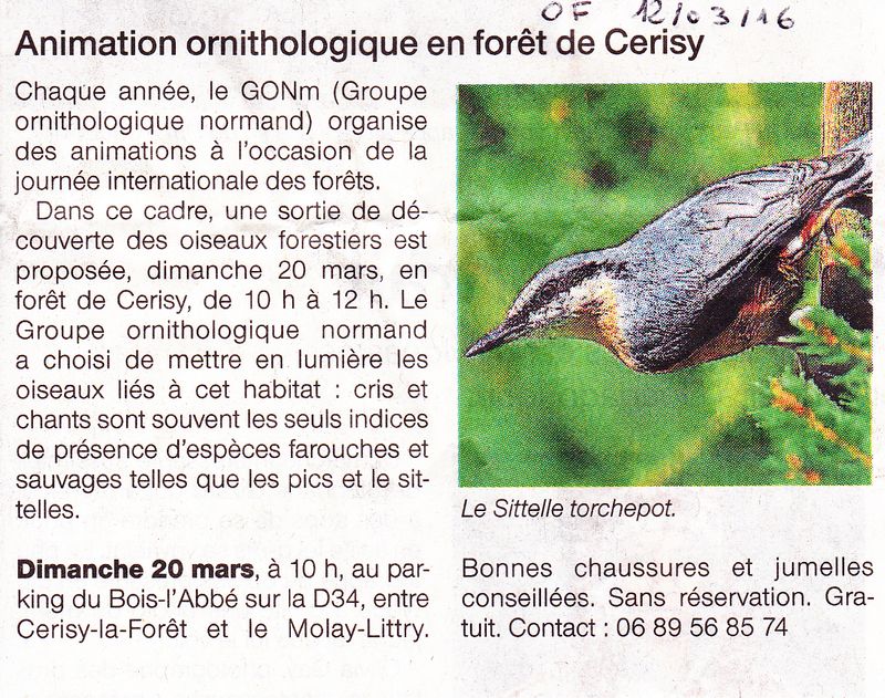 Le week-end des 19 et 20 mars 2016, quatre animations étaient programmées sur le calendrier du GONm. Ouest-France a accompagné trois d'entre elles à Bayeux/14, Cerisy la Forêt/50 et Montviette/14. A noter que les deux dernières ont accueilli plus de 60 participants.