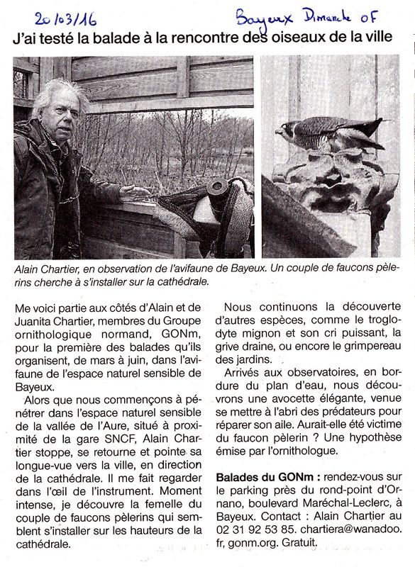 A voir dans l'esprit d'une communication locale, l'article de la Manche Libre sur le faucon pélerin de la cathédrale de Bayeux.