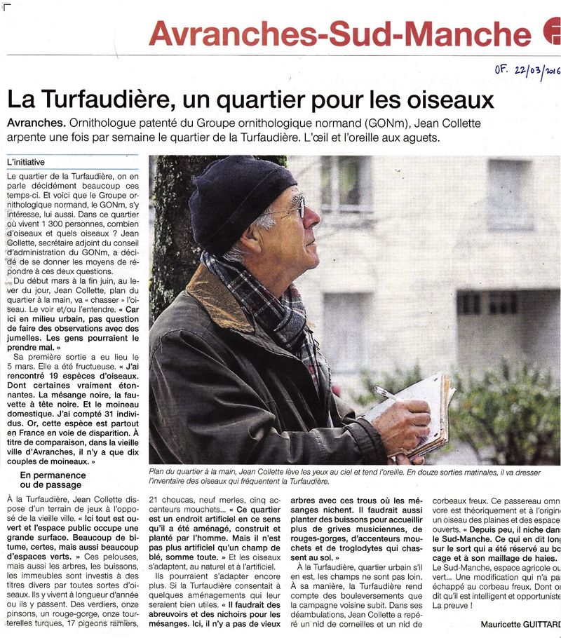 Jean Collette a commencé depuis peu un relevé sur quadrat à la Turfaudière ou Tourfaudière, un quartier populaire d'Avranches/50 . Observant sans jumelles, il a remarqué qu'il était tout de même vu d'un oeil soupçonneux par certains habitants. Il a donc souhaité prendre des précautions pour éviter des soucis. C'est pour cette raison qu'Il a mobilisé la rédaction locale de Ouest-France pour informer les Avranchinais des raisons de sa présence matinale dans les rues du quartier. D'où cet article très explicatif et pédagogique! Cela vaut la peine d'informer pour éviter des malentendus!