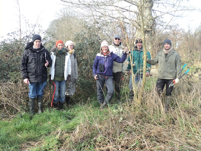 Ce samedi matin 27 février, il fait frisquet... Nous sommes 7 venus armés de cisailles, de scies et de sécateurs chez Carl et Anne. Des jeunes arbres plantés depuis quelques années en une belle bande boisée vont nous servir de terrain d'apprentissage : quels troncs seront des arbres futurs, quels pieds laisser pousser librement en sous étage? Selon l'essence, la situation sur les lisières, les attaques du chevreuil, etc, il faut ou non élaguer le tronc, repérer les fourches principales futures à respecter. Un petit tour d'observation préalable avant de se mettre au travail avait permis de comprendre comment les chanteurs de pinsons se répartissent l'espace à partir de perchoirs définis par les principaux arbres du refuge. Quant au vallon humide en déprise mais en cours de reboisement, c'est un bon exemple de couloir de vie sauvage ( un "corridor" comme on dit maintenant) mais qui demande cependant à Carl un travail d'entretien pour fractionner le roncier en massifs disjoints.