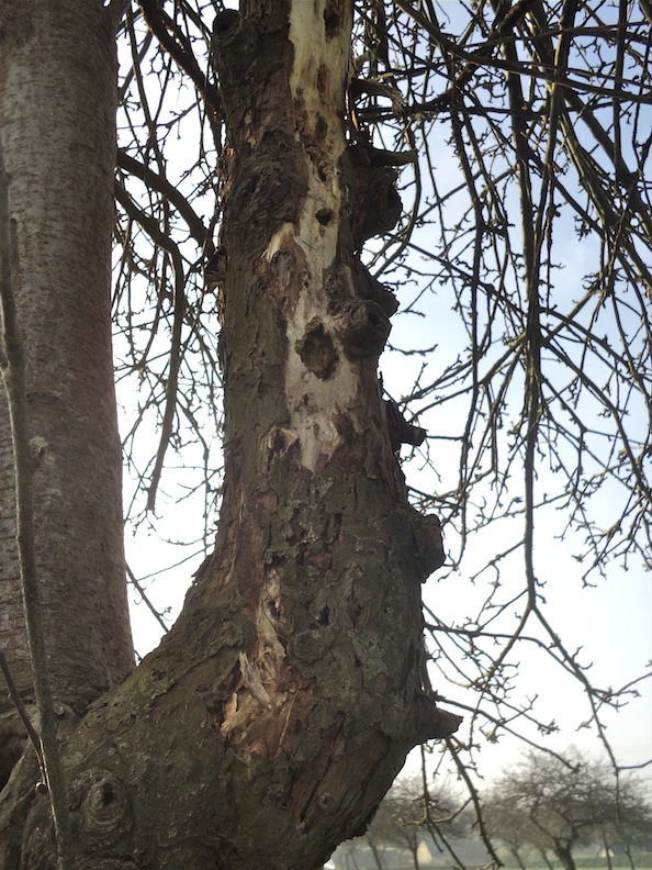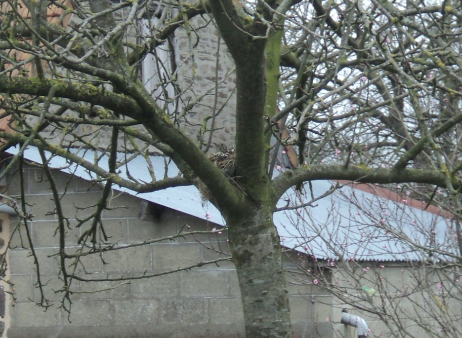 Dans le verger (haute tige), la grive draine occupe le site classique de la fourche principale d'un pommier. Couvaison en cours, nous ne dérangeons pas... Par contre, le rouge-gorge, surpris feuille morte au bec, construit un nid au nord dans le trou de boulin du mur de pierre et n'apprécie pas notre passage. La porte en bois de la grange a été entaillée au sommet pour laisser le passage aux hirondelles et au troglodyte squatteur des vieux nids. Le pigeon ramier couve sur son nid plaqué dans le lierre grimpant dans un noisetier.