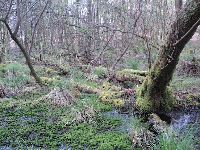 Cas extrême, le ruisseau du refuge du bois du Parc à Sainte-Pience coule difficilement entre racines et troncs morts. Du coup, une grande zone humide à sphaignes s'est installée, riche de mousses diverses et de fougères. Un talus routier augmente encore l'engorgement du sol à faible pente. La mésange nonnette et le pic épeiche n'ont que l'embarras du choix pour aller taper dans le bois mort des aulnes dépérissants.