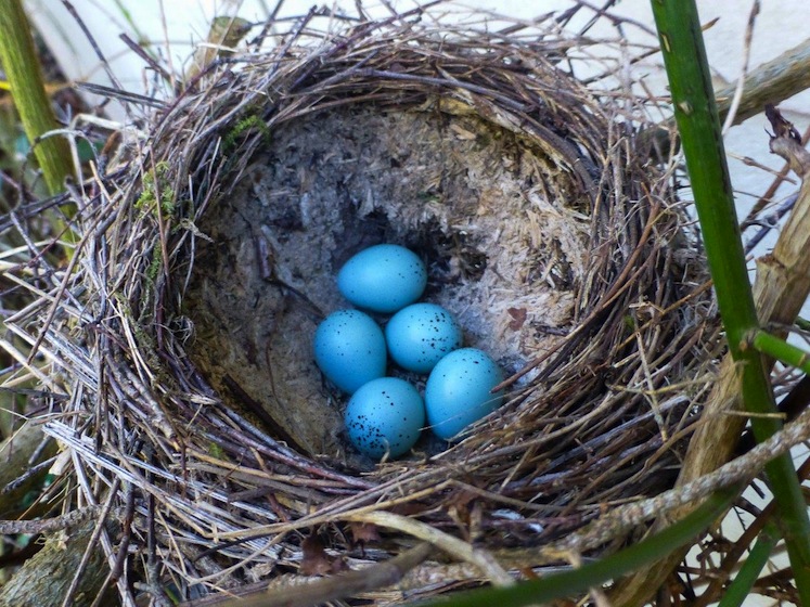 Ce printemps, les grives musiciennes ont élevé leurs poussins sous notre nez, dans le fouillis intérieur du forsythia. Facile de voir les adultes s'envoler et d'en profiter pour faire les clichés sans les déranger.