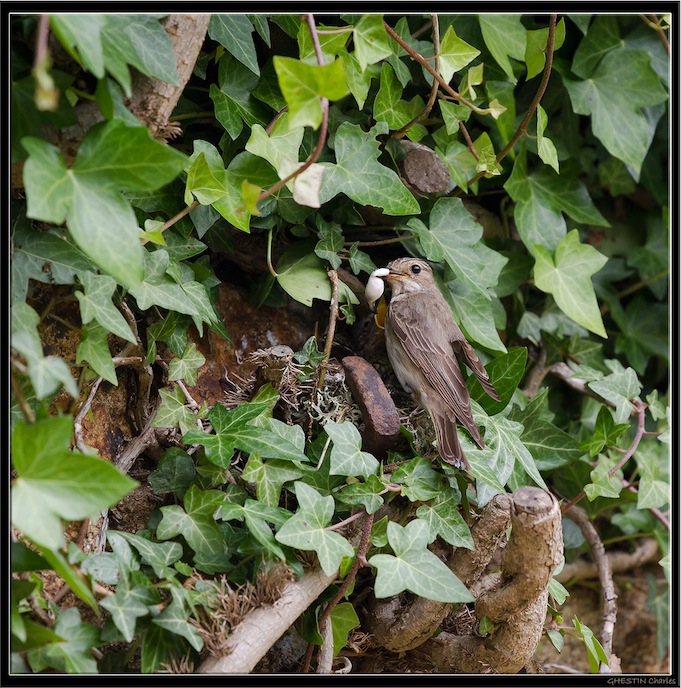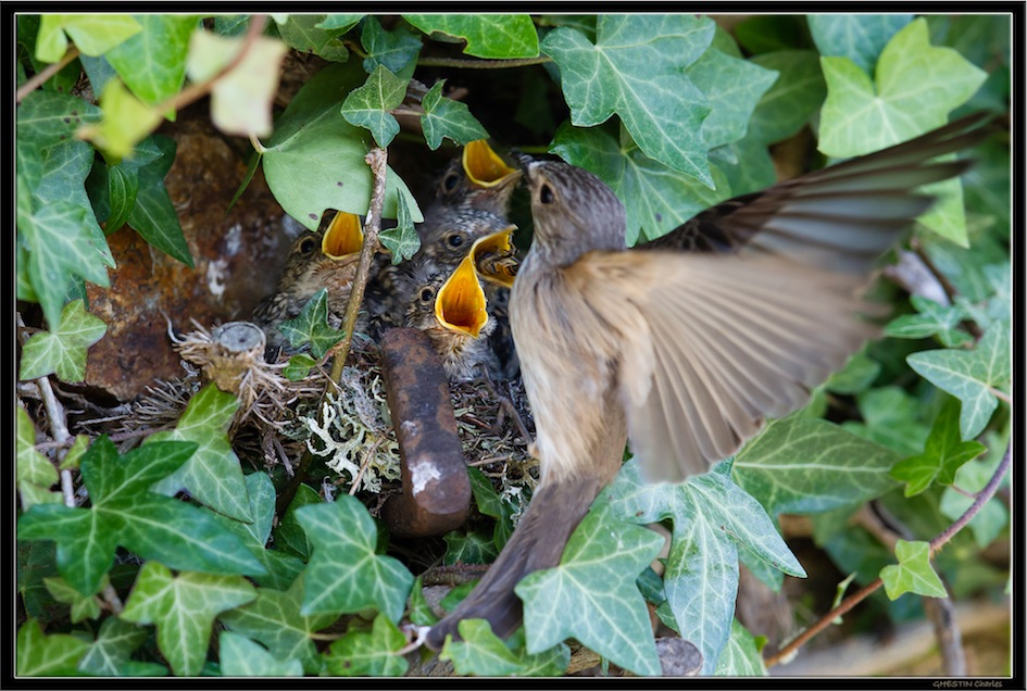 Le gobemouche, parfait insectivore comme l'indique son nom, n'est pas spécialisé "dans la mouche". Le cliché montrant l'adulte avant le nourrissage rappelle que cet oiseau est capable de capturer toutes sortes de proies volantes, ici des diptères mais aussi des papillons; quelle dextérité pour capturer des proies en vol alors que le bec est déjà "occupé"! (Un peu comme les macareux...) Ici, au moins 5 proies ensemble! Dorst cite le gobemouche noir, espèce voisine, qui nourrit ses jeunes 33 fois par heure, soit 6200 fois pour élever une nichée. "Les adultes perdent jusqu'à 20% de leur poids pendant la période de reproduction". Les oisillons sont d'extraordinaires machines à croitre : le poussin de coucou multiplie son poids de naissance par 50 en 3 semaines! Quel rendement!!! La cavité buccale des poussins toujours très colorée à l'intérieur est une incitation à remplir les estomacs affamés. En contrepartie, les excréments sont expulsés hors du nid, heureusement enfermés en général dans un sac élastique qui permet aux adultes de les emporter loin du nid (ou de les avaler...)