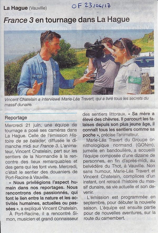L'émission "Histoire de sa balader" est diffusée sur FR3 le dimanche midi. Une séquence consacrée au massif dunaire autour de Vauville a été filmée récemment : Marie-Léa du GONm, garde conservatrice de la RNN de la mare de Vauville, en a retracé l'histoire, la richesse naturaliste et aussi les perspectives d'évolution dans les années à venir. Ce reportage sera diffusé en septembre 2017. Ouest-France s'est fait l'écho de ce tournage.
