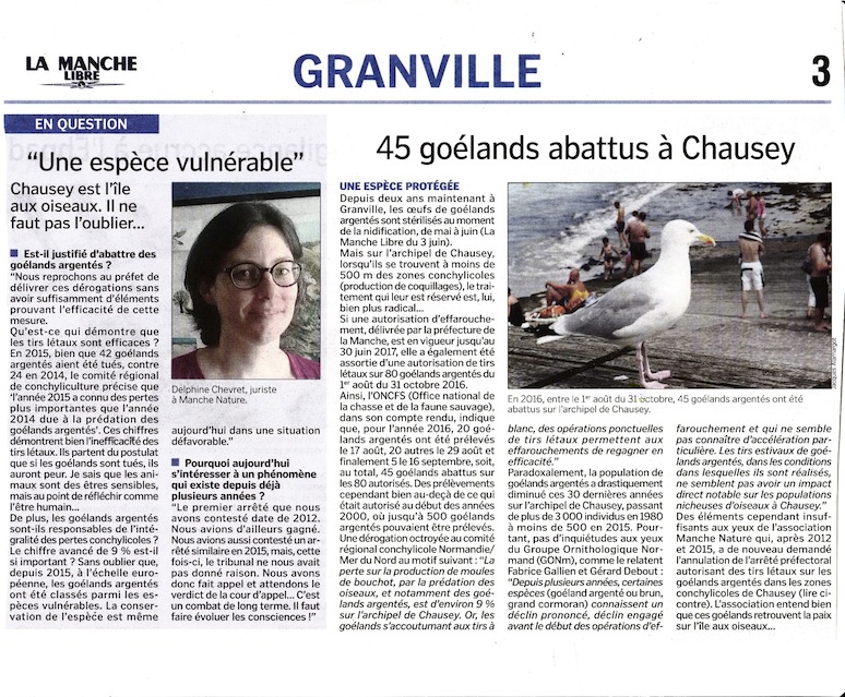 L'article de la Manche Libre est plus nuancé et plus précis. Il donne la parole à Delphine Chevret, juriste de Manche Nature et le GONm, par l'intermédiaire de Gérard Debout et Fabrice Gallien, livre des informations précises sur l'évolution des populations de goélands dans la région. Il émet des doutes sérieux sur l'impact de ces tirs létaux sur le comportement des goélands. Pour en savoir plus, lire le message suivant de Gérard Debout.