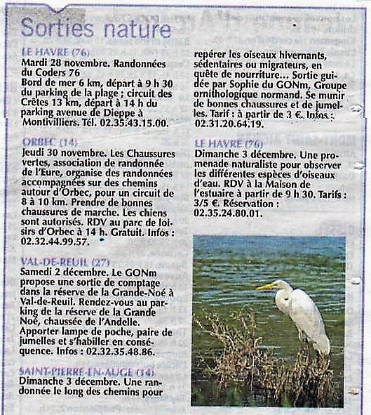 Cette annonce parue dans Liberté Dimanche permet de rappeler deux animations organisées le week-end à Val-de-Reuil (27) et Montviette (14). Un petit os : il n' y a pas d'heure indiquée pour le début de ces animations. Pas grave, un coup de fil suffira pour régler le problème ou un coup d'oeil sur le calendrier du GONm qui nous indique : 15:30-17:30 à Val-de-Reuil et 9:30 à Montviette.
