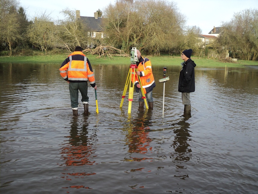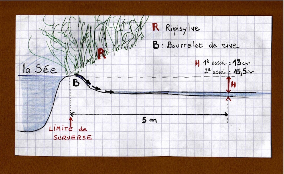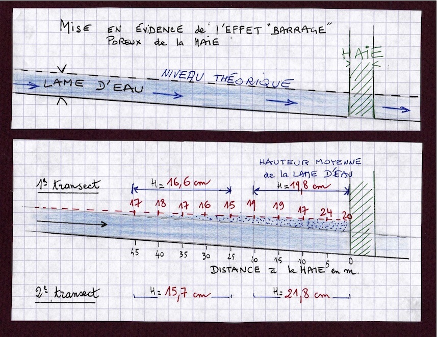 Deux géomètres sont venus vérifier à l'aide d'un théodolite la différence de niveau de l'eau avant et après la haie transversale au flot de crue. Au moins 10 cm d'écart en 5 m, preuve en main, ça confirme l'effet de chute observé "à la sortie" de la haie en aval. La haie joue bien le rôle de filtre semi perméable et freine le flot.