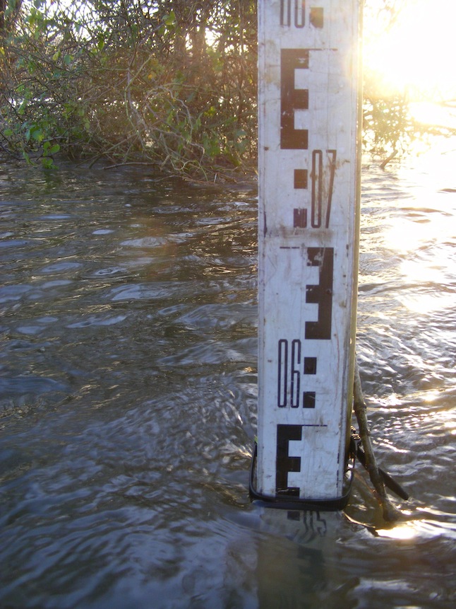 L'échelle de crue installée par les géomètres de l'entreprise LTP Loisel permet de mesurer les variations du niveau d'eau dans la réserve. Peu à la fois : du 31/12 au 03/01, on monte de 5 cm; puis du 3 au 5, de 14 cm. Petits chiffres, mais sur plus de 1200 ha, il y a de quoi commencer à monter les meubles au premier étage...