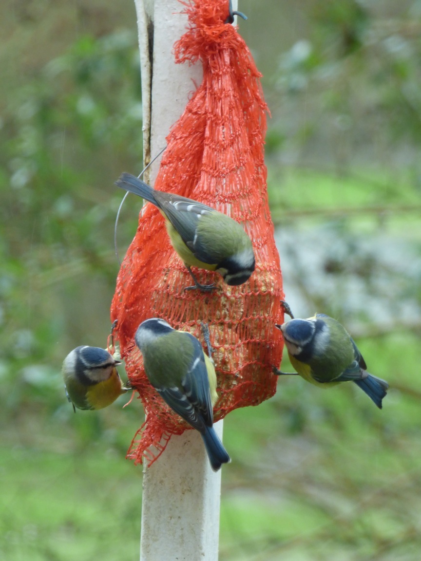 Au jardin, depuis un mois, 10+ mésanges bleues et 4 charbonnières. Ici, en fond de vallée de la Sée, la mésange noire est passée au moins 2 fois dans les haies, mais pas aux mangeoires.