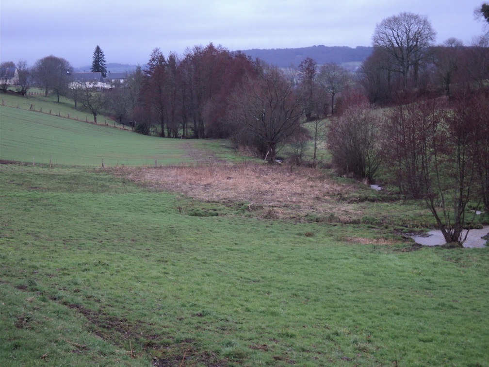 8 mars, couple de colvert posé sur la prairie humide en fond de vallon : loin de tout "marais", le colvert trouve cependant là un habitat qui lui convient. La bécassine des marais est aussi présente sur ce vallon bocager et le couple de bergeronnette des ruisseaux est fidèle au ruisseau rapide. Au mètre près, celui de la limite entre le refuge (bio) et le voisin agriculteur "conventionnel", la zone humide est banalisée, couverte du même semis que sur le reste de la parcelle. Inutile de discourir sur la biodiversité perdue, la photo suffit... Ces petites surfaces présentes à des centaines d'exemplaires un peu partout dans les fonds de vallées du Massif armoricain subissent de plein fouet la "mutation" agricole : drainées et mises en cultures, abandonnées à la déprise au bonheur des ronciers (un moindre mal), remblayées discrètement loin des yeux (mais que peut l'ONEMA?...); il ne fait pas bon être grenouille rousse ni bouscarle de passage.