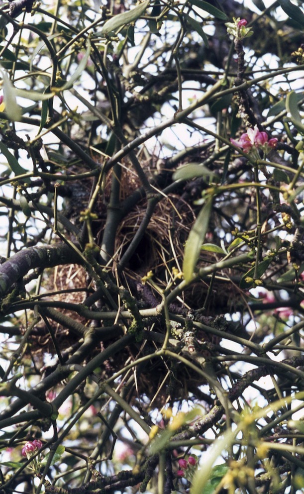 Deux vieux documents en relation : une colonie de nids posés sur un transformateur dans l'Eure et un nid aérien dans une boule de gui sur pommier (utilisant comme base un nid de grive draine.)