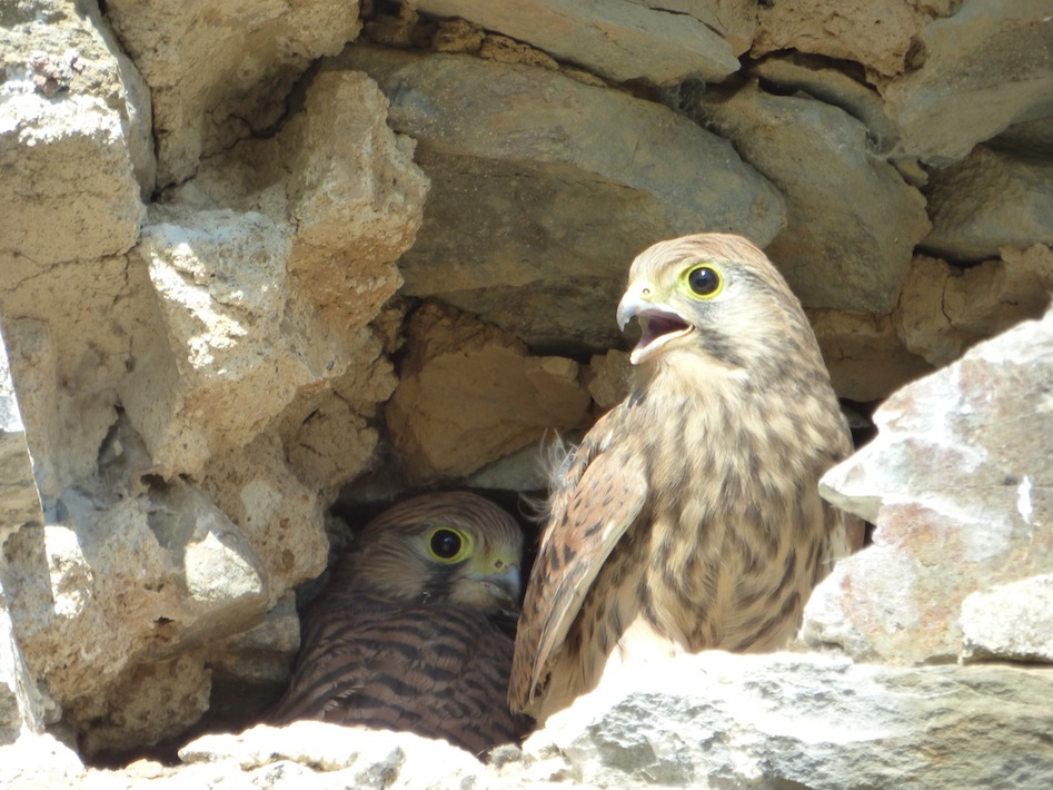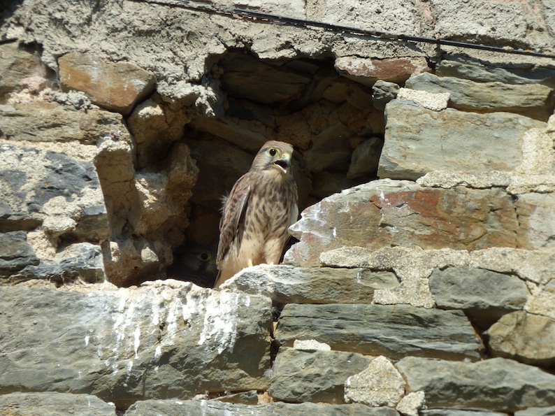 L'an dernier, un nid de frelon asiatique a dû être détruit dans le mur d'une ferme de Tirepied, l'activité d'accueil du public rendant nécessaire cette intervention. Le service compétent a fait le travail, mais pas la remise en place des pierres qu'il avait fallu déplacer. D'où l'offre nouvelle d'une belle cavité pour le couple de faucon crécerelle de la ferme qui a aussitôt profité de l'occasion. Trois poussins à l'aise, mais l'un d'eux a quand même chuté, et très peu farouches, habitués au passage de l'homme... (La photo est prise à moins de 20 m sur une échelle)