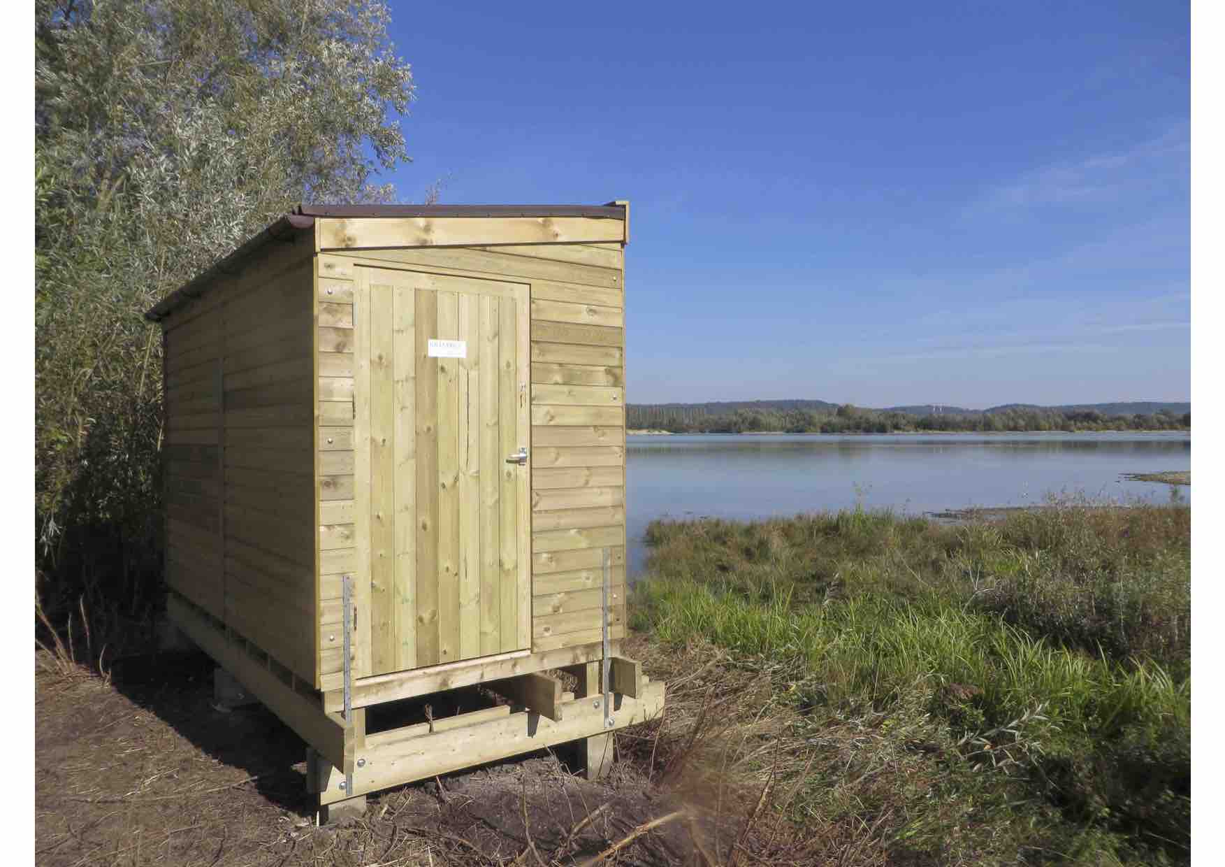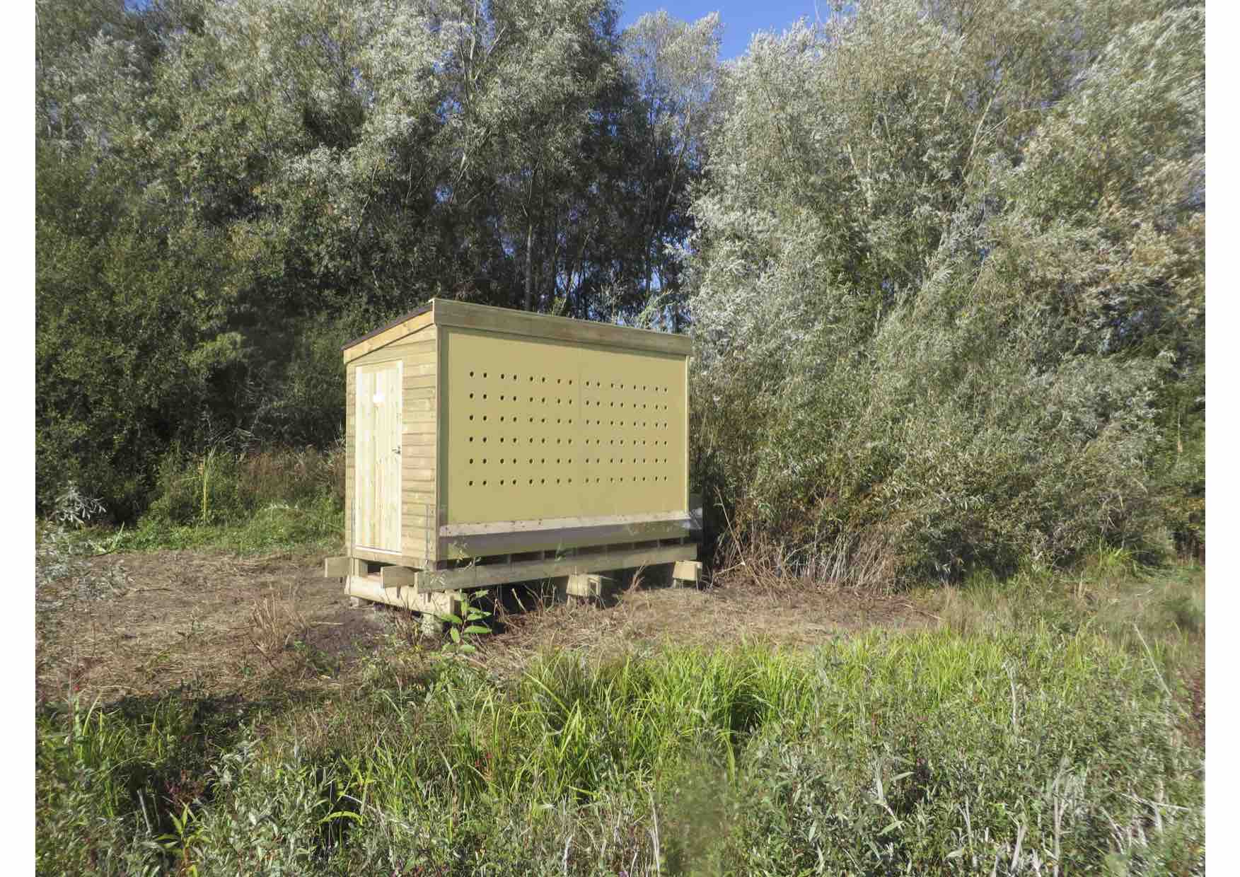 La boucle de Anneville-Ambourville, où se situe la réserve de Berville-sur-Seine, accueille aujourd’hui 2 colonies d’hirondelles de rivages (environ 300 couples), toutes deux en carrières, dont l’une d’entre elle devrait bientôt fermer, entrainant la disparition de sa colonie. Ce destin est celui qui attend toutes les colonies qui se sont développées en carrière. Sachant qu’environ 80 % de la population est dans ce cas (Chevalier in Debout, 2009), l’avenir de la population normande d’hirondelle de rivage est sombre. En attendant une gestion des cours d’eau respectant la dynamique de l’écosystème et permettant de générer naturellement des habitats favorables à l’hirondelle de rivage, le GONm et son partenaire Cemex ont choisi d’expérimenter, sur la réserve de Berville, un équipement artificiel développé par l’entreprise anglaise Gilleard Bros. Il s’agit d’une sorte de cabane en bois avec une façade percée de trous menant à des nichoirs. Les nichoirs sont facilement accessibles nous offrant la possibilité de les nettoyer pour limiter le développement de parasites.