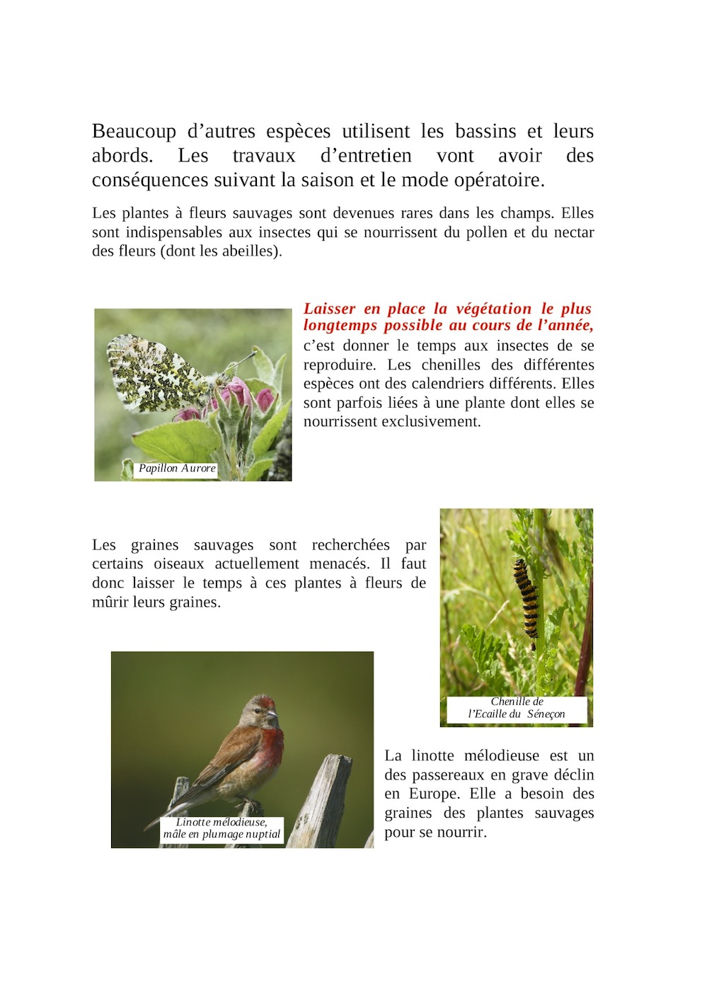 Le document qui suit résume des observations réalisées sur quelques bassins sur le trajet de l'A84 entre Saint-James et Poilley. La commande passée par la DIRNO portait sur la rédaction d'un document synthétisant des pistes de gestion favorables à la biodiversité. Une présentation sur le terrain et en salle le 30 mai 2018 à Poilley a complété cette opération, journée s'inscrivant dans la démarche de développement durable de la DIRNO en 2018. Cette plaquette est destinée à être diffusée auprès des agents chargés de l'entretien des bassins distribués au long des 1 000 km de voies normandes dont la DIRNO a la responsabilité (et d'autres hors Normandie jusqu'à Vendôme!)