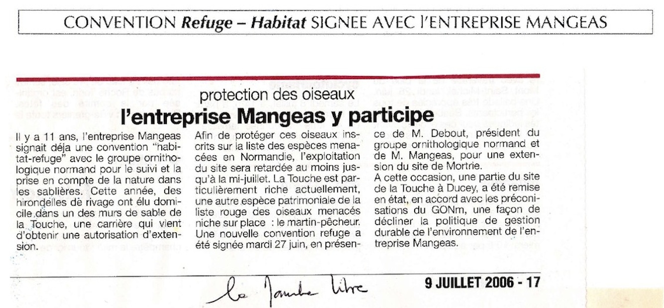 Quelques documents pour illustrer les relations anciennes entre le GONm et l'entreprise Mangeas (sablières à Ducey/50). A diverses occasions, nos données ont participé à la construction de dossiers administratifs sachant qu'il était de l'intérêt de l'avifaune que nous appuyions les choix de l'entreprise dans le sens des orientations écologiques favorables à la biodiversité.