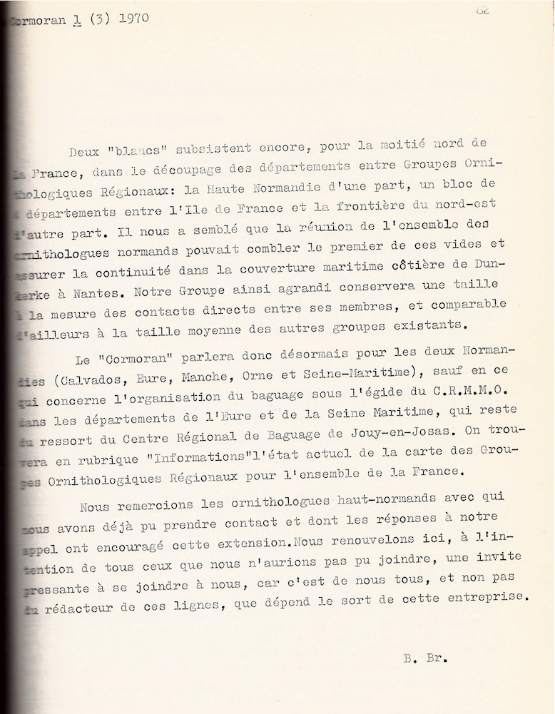 Au vu du partage de l'espace en cours entre groupes déjà constitués (Ar Vran en Bretagne, Groupe ornithologique nord, Groupe ornithologique parisien, Centre d'Etudes Ornithologiques de Bourgogne, Ligue Haut-Rhinoise pour la protection des Oiseaux, Centre Ornithologique Rhône-Alpes), Bernard Braillon propose de joindre les deux départements de Haute-Normandie au noyau bas-normand.