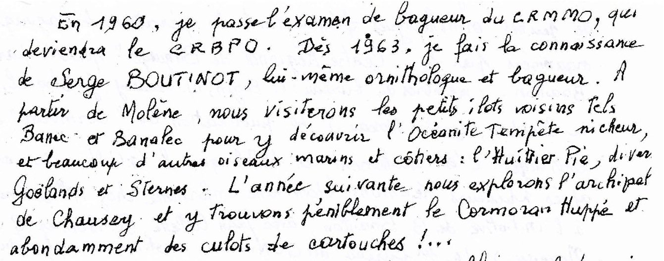 Dans le courrier où G. Moreau dresse la revue chronologique de ses activités, il rappelle un souvenir concernant les nicheurs de Chausey au printemps 1964 : les cartouches signent l'activité destructrice des "chasseurs" venant faire des cartons sur les oiseaux marins nicheurs.