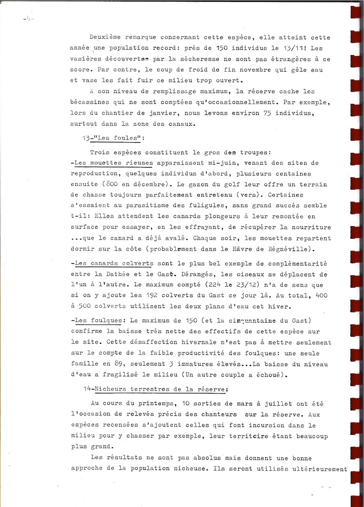 - "Nous réitérons chaque année la même demande, à savoir l'extension de la réserve ornithologique sur le rive gauche de la queue." Données collectées au cours de 96 sorties et sans déranger les oiseaux vu la configuration des lieux, grâce à l'intérêt de 9 mordus.