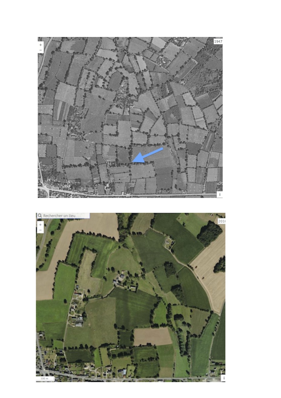 - Comparaison du bocage de Juvigny-le-Tertre: photos 1950-1965 et 2006-2010. Le nid est localisé par la flèche bleue.