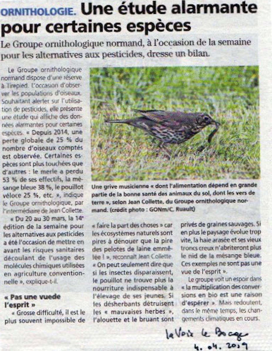 La Voix le Bocage, hebdomadaire du Virois, reprend un communiqué transmis par le GONm à l'occasion de la semaine pour les alternatives aux pesticides. Le sujet avait été traité (sans pesticides) auparavant par Ouest-France et la Gazette de la Manche viewtopic.php?f=12&t=708&start=10#p6603.