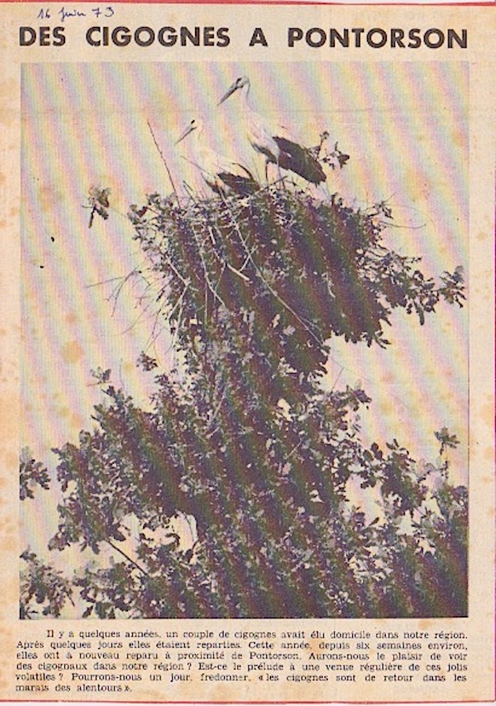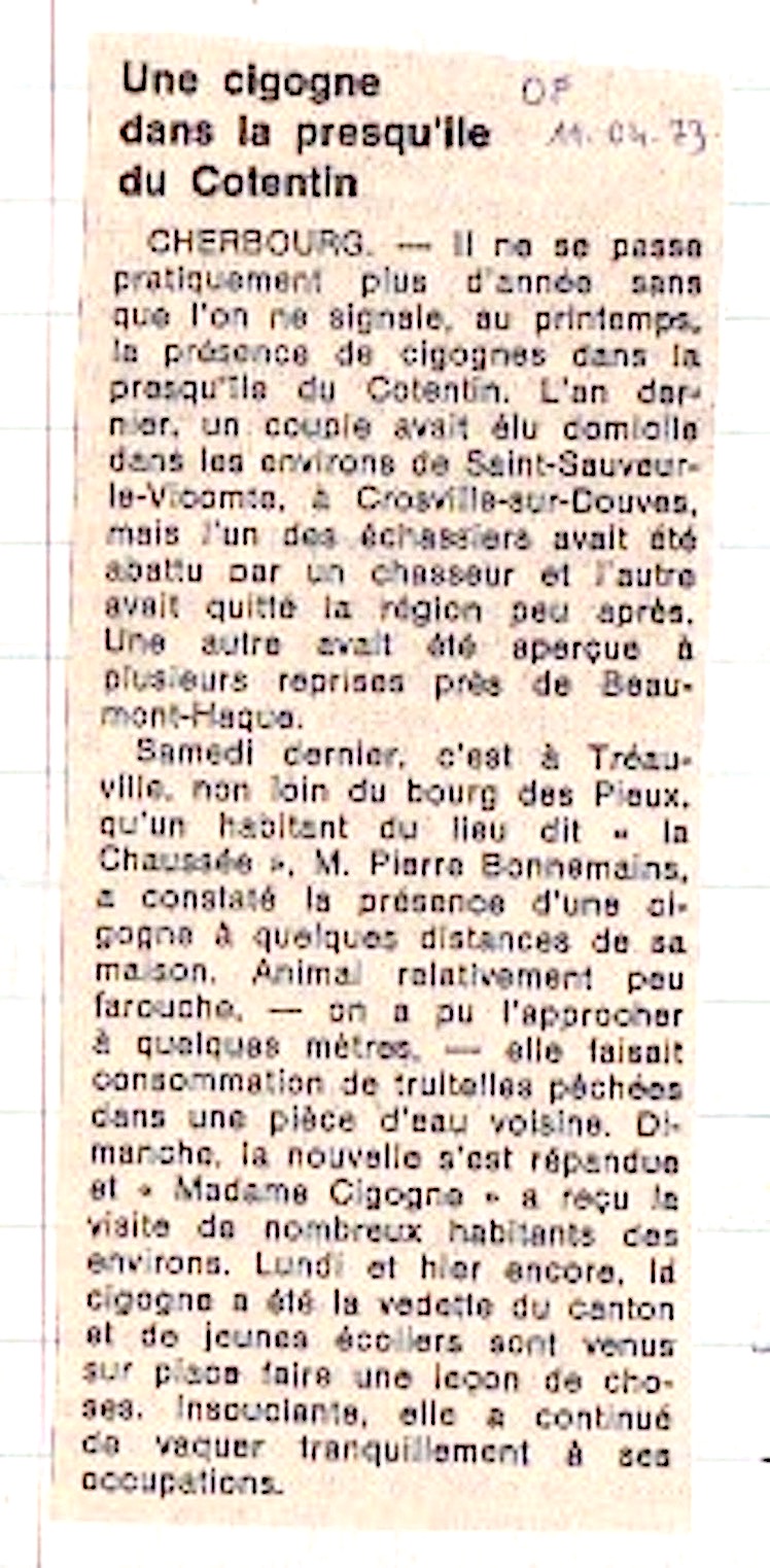 - Ouest-France, 28 mars 1979. Enquête lancée par le GEPCN pour connaitre les effectifs réels de cigognes en Normandie.
