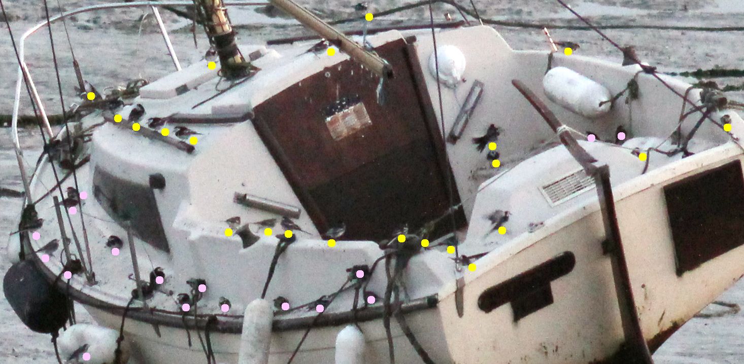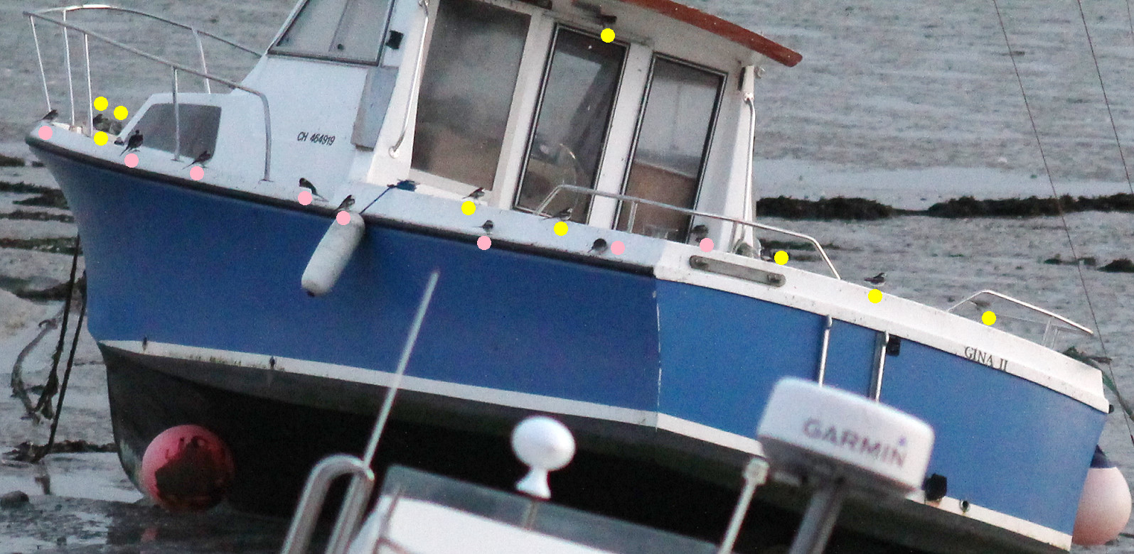 En revanche, quand un voilier est totalement couvert de bergeronnettes, mais qu'on ne peut en voir entièrement qu'un flanc (forcément), on peut alors estimer et ajouter sans risque le nb de piafs présents mais invisibles sur des portions de l'autre flanc.