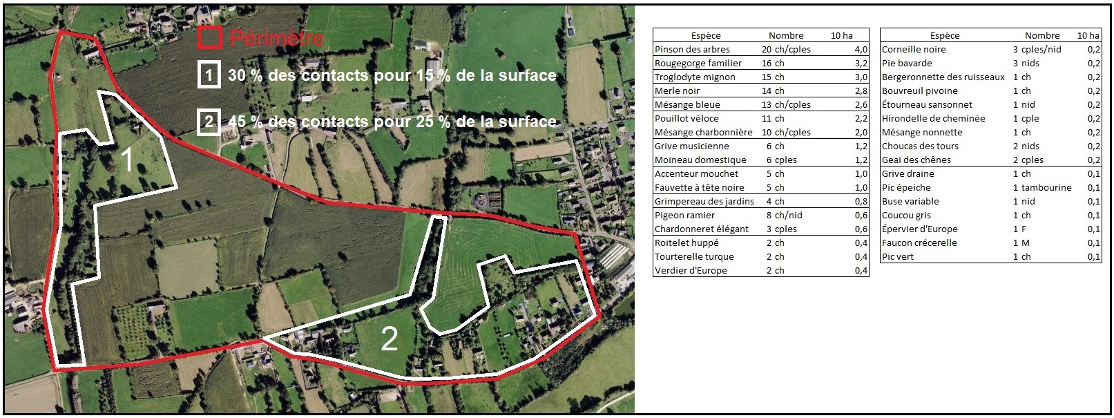 Bilan, 164 contacts (chanteurs, couples, nids…) se rapportant à 33 espèces, et une densité corrigée tenant compte très approximativement de la dimension « réelle » des territoires des espèces à grands cantons, de l’ordre de 30 couples pour 10 ha. Cependant, on remarquera sur la vue ci-dessous, que 75 % des effectifs se concentrent sur 40 % de la surface. D’une part, sur le secteur partiellement urbanisé à l’est, et d’autre part, dans le vallon à l’ouest, où les densités sont de 60-65 couples pour 10 ha. Autrement dit, le reste de la zone comporte des densités très modestes de l’ordre de 12-14 couples pour 10 ha !