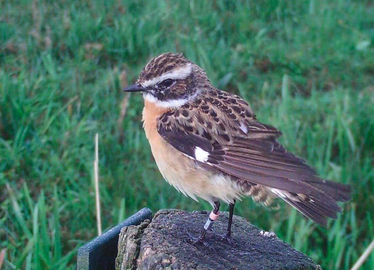 Les pièges photo ont parlé. Ce tarier mâle 7011874 est le plus vieux encore en vie sur nos parcelles. Bagué le 10 mai 2016 adulte de 2ème année (tout comme le merle, en main il est possible de faire la distinction entre un tarier né l'année précédente d'un tarier né avant), si bien que nous savons de façon certaine qu'il est né en mai ou juin 2015. À ce jour, il a presque 5 ans, ce qui constitue un âge avancé pour ce petit passereau qui a déjà parcouru près de 50 000 km entre sa région de nidification et sa zone supposée d'hivernage.