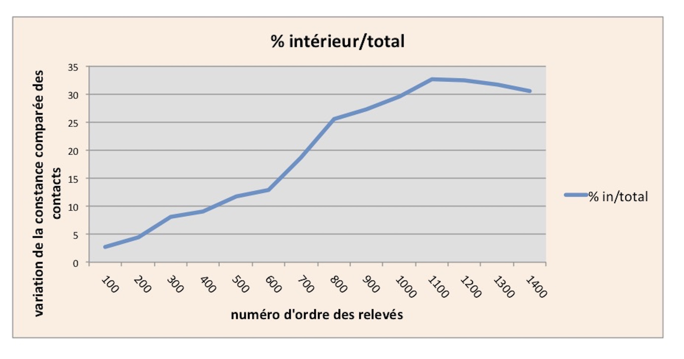 Premier cas, les choucas: ils sont progressivement apparus d'abord sur le clocher de l'église puis les cheminées des maisons du bourg, maintenant aussi à l'écart de l'agglomération. Cette année 2020, j'ai abandonné la lutte contre l'installation des couples dans les cheminées de la maison. Un couvreur est venu grillager la cheminée "sensible". Paradoxalement, le seul oiseau tombé dans un des conduits et sauvé fut un pigeon ramier. Le fait majeur à noter, c'est l'évacuation du groupe de pigeons bisets qui nichaient dans le clocher! Vers 2012 (relevé 750, ordre de grandeur à affiner!), la constance du choucas dépasse celle du biset qui va finir par abandonner complètement le bourg! Autre exemple, celui de la tourterelle turque. La courbe d'évolution de la constance cumulée montre des variations. A partir de 2007 (relevé 600) jusqu'en 2012 (relevé 800), les contacts à l'intérieur de la réserve sont nettement plus nombreux. Cela se traduit en particulier par la construction de nids dans les haies bocagères de la réserve comme si la densité de nicheurs sur les jardins et bâtiments en limite de bourg faisait que les couples surdensitaires devaient occuper de niches moins favorables à la périphérie et donc dans le bocage voisin. La pente tout en restant positive, ralentit jusqu'en 2016 (relevé 110) avant de décroitre ensuite, ce qui signifie que moins de tourterelles turques sont notées à l'intérieur de la réserve. On peut en déduire un affaiblissement de la pression démographique sur le bourg, probablement à mettre en relation avec une décroissance de la population locale.