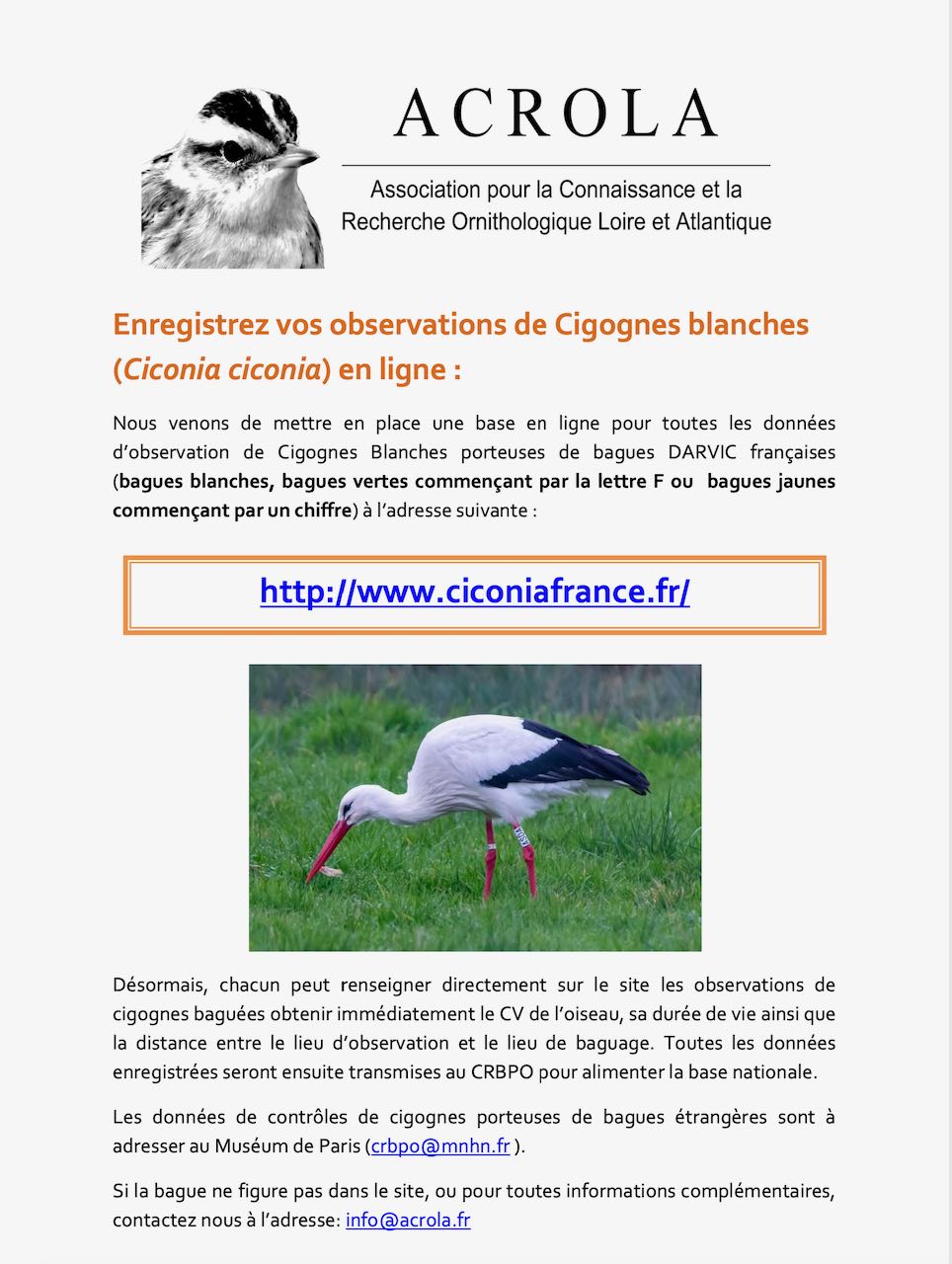 Hubert Dugué et Jean-Yves Brié viennent de mettre en ligne une base de données des cigognes blanches baguées gravées depuis 2001. Ce gros travail va nous permettre de renter en ligne les contrôles de cigognes blanches et de consulter en direct l' historique de celles que vous avez contrôlées.