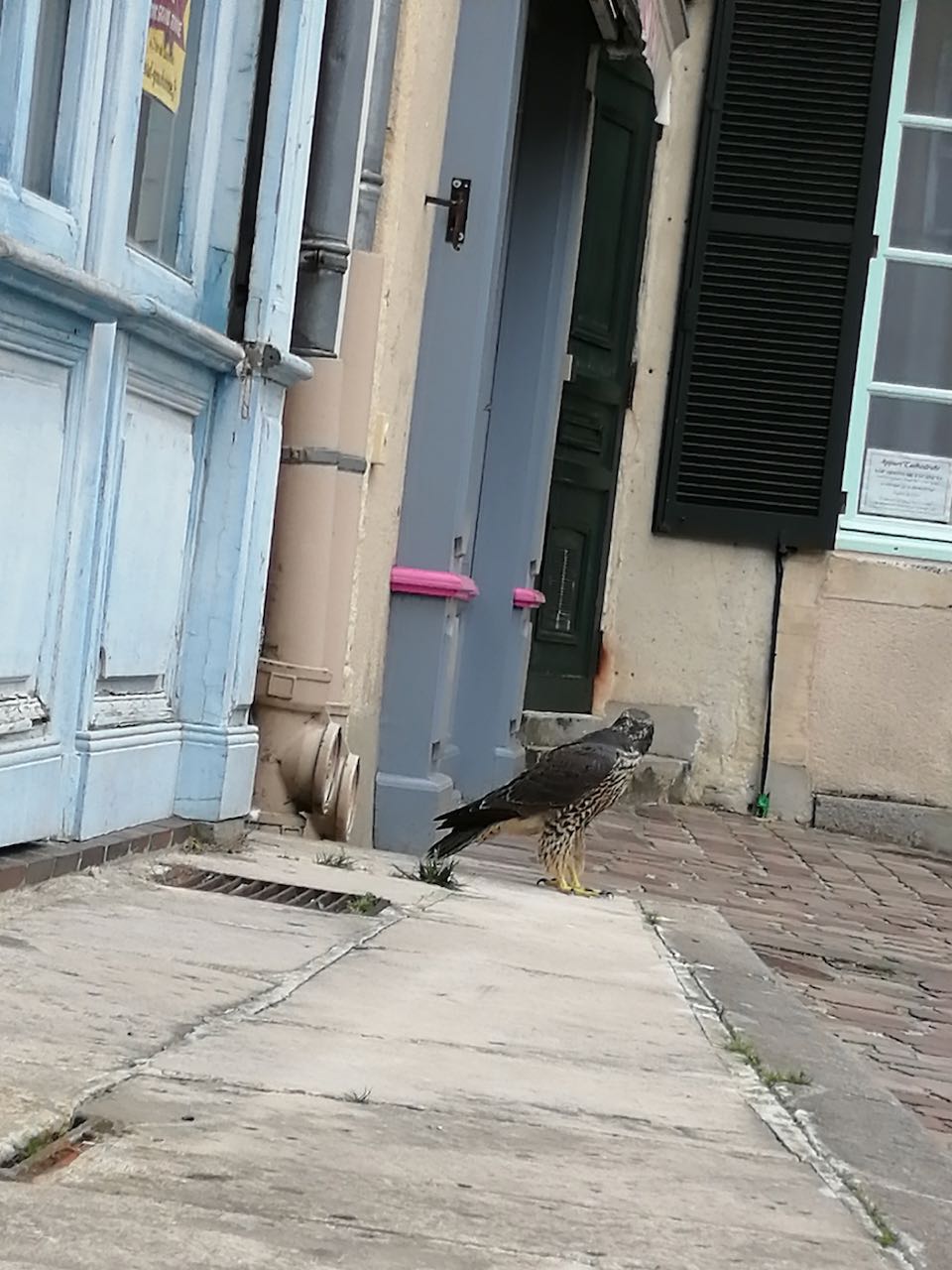 La nidification du faucon pèlerin est à son terme avec hier la chute sans conséquence de 2 jeunes suite à la montée d'un groupe de personnes dans le clocher principal de la cathédrale alors que ces jeunes étaient à quelques jours de l'envol. L'un d'eux (jeune femelle) avait plané jusqu'à l'entrée latérale de la cathédrale et était admiré (mais craint) par une foule de touristes et les pompiers appelés à la rescousse. L'autre (jeune mâle) ayant atterri sur un muret à quelques m de hauteur. Contacté par la municipalité et arrivé sur place, je les ai regroupés sur le muret où ils n'étaient guère effrayés par les badauds qui passaient. Combien de photos prises dans la journée par toutes ces personnes étonnées !