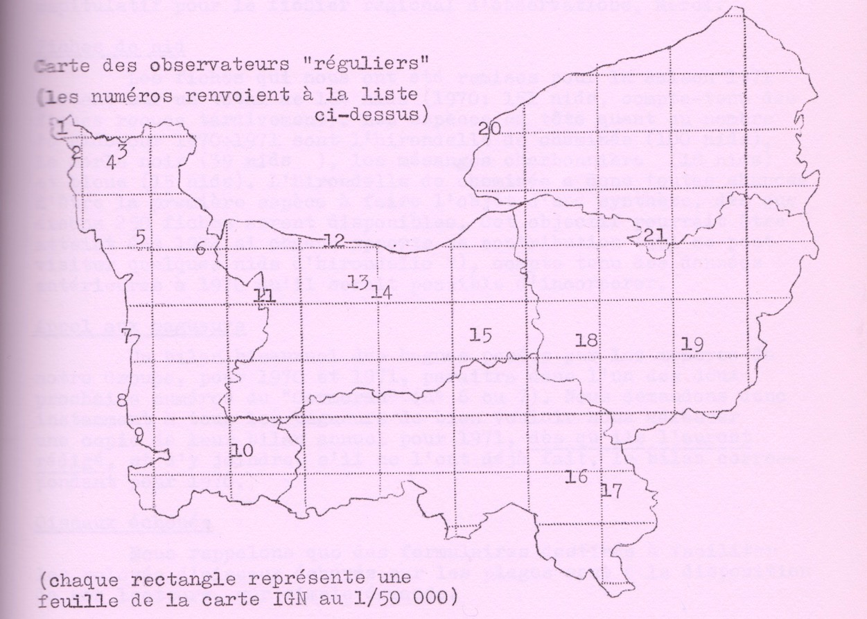 A partir des premiers envois d'observations au fichier, il dresse une liste des observateurs réguliers. La carte ne tient pas compte des quelques lieux habituels des stages ou des camps de baguage. Vu le petit nombre d'observateurs, il fallait une belle dose d'optimisme pour s'attaquer à l'atlas des oiseaux nicheurs de France en cours! Le coordinateur pour la Normandie sera Bernard Bernier.