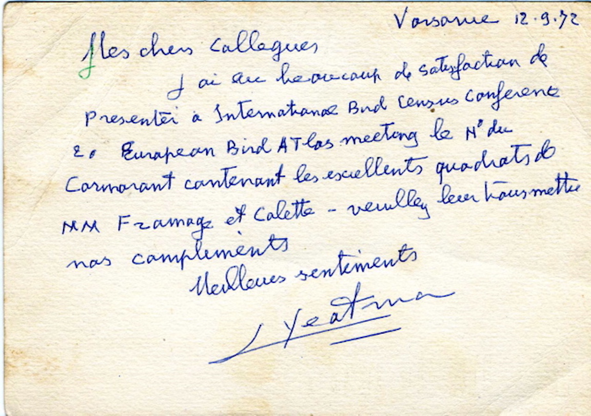 Nous aurons le plaisir de recevoir en septembre 1972 une carte postale de Laurent Yeatman. Pour nous, jeunes ornithos amateurs régionaux, c'est un signe de reconnaissance marquant ; L. Yeatman est le responsable coordinateur de l'enquête atlas des oiseaux nicheurs de France en cours à cette époque.