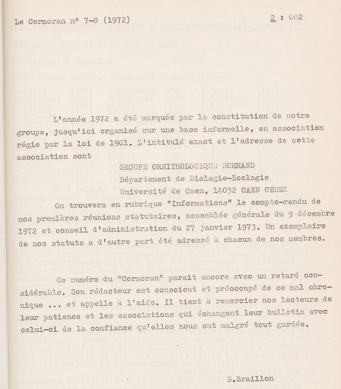 L'éditorial qui ouvre le tome 2 (n° 7-8) annonce un évènement : la création officielle du Groupe ornithologique normand en 1972. B. Braillon résume la démarche page 56 du même numéro en rapportant la tenue de la première assemblée générale de décembre 1972. La mise au point des fiches de restitution des observations envoyées tous les 6 mois (fin février et fin août) dites "RSS" (relevés systématiques saisonniers) est due au travail d'organisation de B Braillon. Ces fiches sont ensuite partagées entre les rédacteurs des chroniques publiées dans la revue, mais surtout, elles enrichissent le fichier de l'association qui en conserve la mémoire brute. Nous en sommes encore à "découvrir" l'avifaune de notre région. Aussi bien l'arrivée de nouvelles espèces (le pic noir) que l'arrivée de nouveaux observateurs (j'arrive dans le Mortainais et apprends à connaitre le pic cendré) enrichit le fichier. Cette période est féconde pour le GONm naissant : l'enquête atlas des oiseaux nicheurs conduite par L Yeatman à l'échelle nationale (publié en 1976) est un défi pour les quelques observateurs normands!
