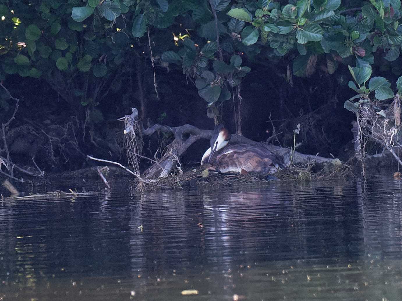 Le 2 juillet je retourne au plan d'eau voir l'évolution de la situation. Le frêle nid de la veille est en piteux état et abandonné, je fais le tour de l'étang et j'ai le plaisir de voir un nid digne de ce nom, situé au bord de l'île, donc séparé des humains par 35m d'eau. Un foulque semble couver, et l'autre n'est pas loin. Le 3 juillet , le nid est toujours là, les oeufs ne sont pas visibles, mais apparemment les grèbes s'en occupent et couvent, tout va bien. Tout continue paisiblement et le 16 juillet en cherchant le deuxième grèbe, je découvre un grèbe en train de couver dans un autre nid, à l'ombre, caché sous des arbres à 2 ou 3m du bord du plan d'eau. Le 17 juillet, en faisant le tour de l'étang, j'aperçois le 2ème nid à travers un trou dans le feuillage des arbres avec un oeuf. Comment ces deux nids vont-ils évoluer dans les jours qui viennent ? Les grèbes auront-ils des petits ?