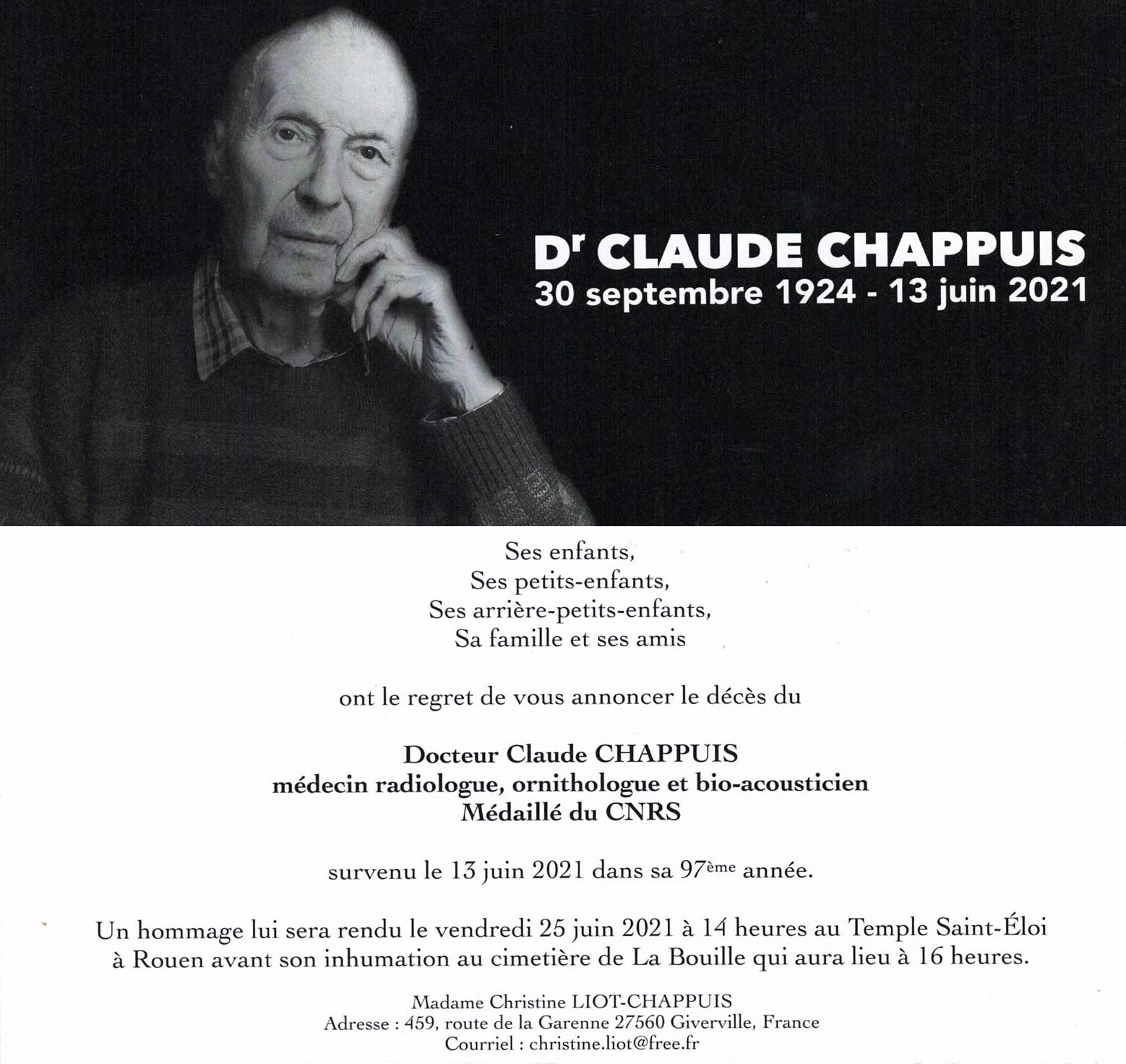 Réservé, mais passionné, Claude Chappuis était un grand scientifique ; sa disparition nous prive d’un témoin extraordinaire de l’ornithologie du XX° siècle