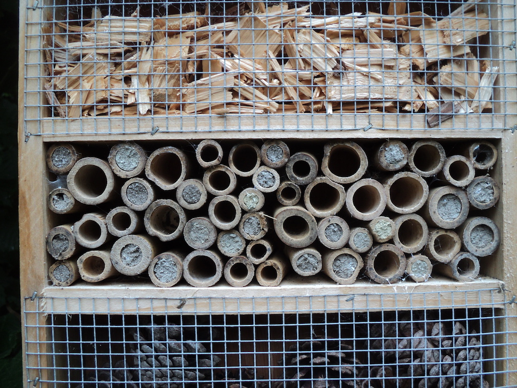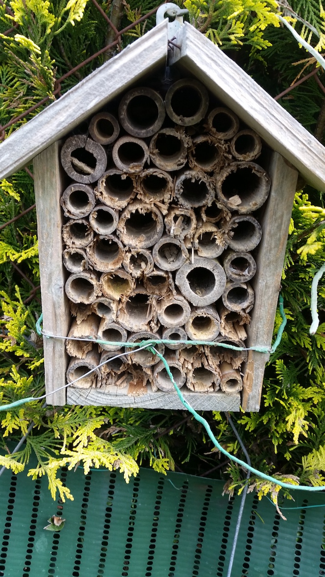 Un pic épeiche a fait une razzia en pillant les tubes dhôtels à insectes du jardin de notre collègue Agnès aux Cresnays/50, appliquant la même technique sur 5 "hôtels"! Les tubes occultés occupés par les larves des abeilles solitaires ont été systématiquement ouverts et vidés. Même ceux qui étaient protégés par un grillage ("il" n'en est pas à son coup d'essai) ont été atteints en passant par le bas...
