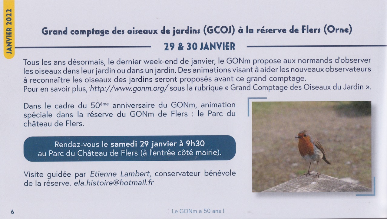Le prochain rendez-vous qui vous est proposé dans le cadre de cet anniversaire aura lieu à la réserve GONm de la Grande Noé le 12 mars (cf. le programme page 12 du livret du 50° anniversaire que vous avez reçu.