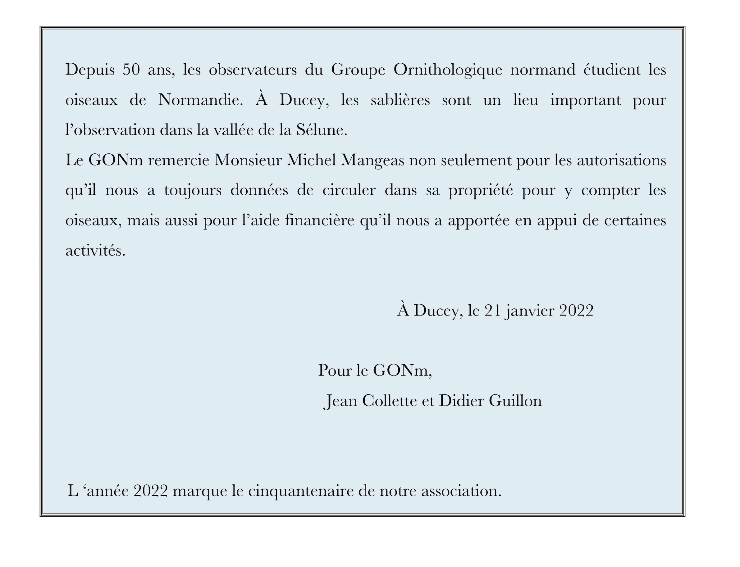 Une initiative locale dans le Sud-Manche transposable ailleurs : "mettre à l'honneur" des personnes ou des structures qui nous ont aidés - et les oiseaux par voie de conséquence" durant ces 50 ans.
