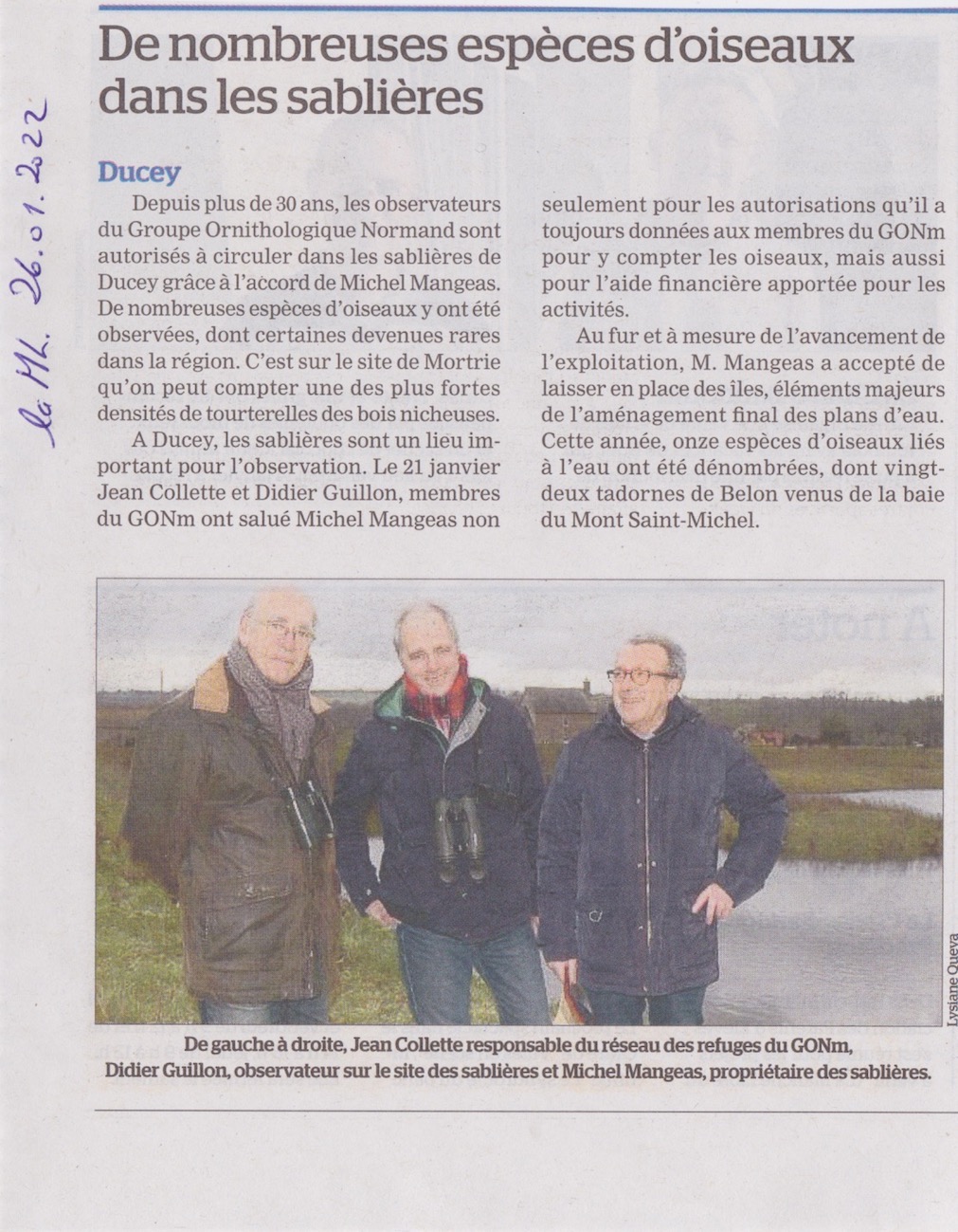 En janvier, Monsieur Mangeas, propriétaire des sablières de Ducey/50 a accepté que nous le rencontrions en présence de la presse locale pour le remercier des rapports cordiaux qu'il a noués avec notre association. Un texte a été préparé pour la presse et un petit souvenir lui a été remis au nom du GONm. Mon collègue Didier GUILLON qui suit l'avifaune des sablières m'accompagnait pour l'occasion. En 2002, pour marquer ses 30 ans, le GONm avait aussi programmé une série d'événements au cours de l'année. Michel Mangeas et ses deux entreprises avaient financé la brochure de présentation du programme.