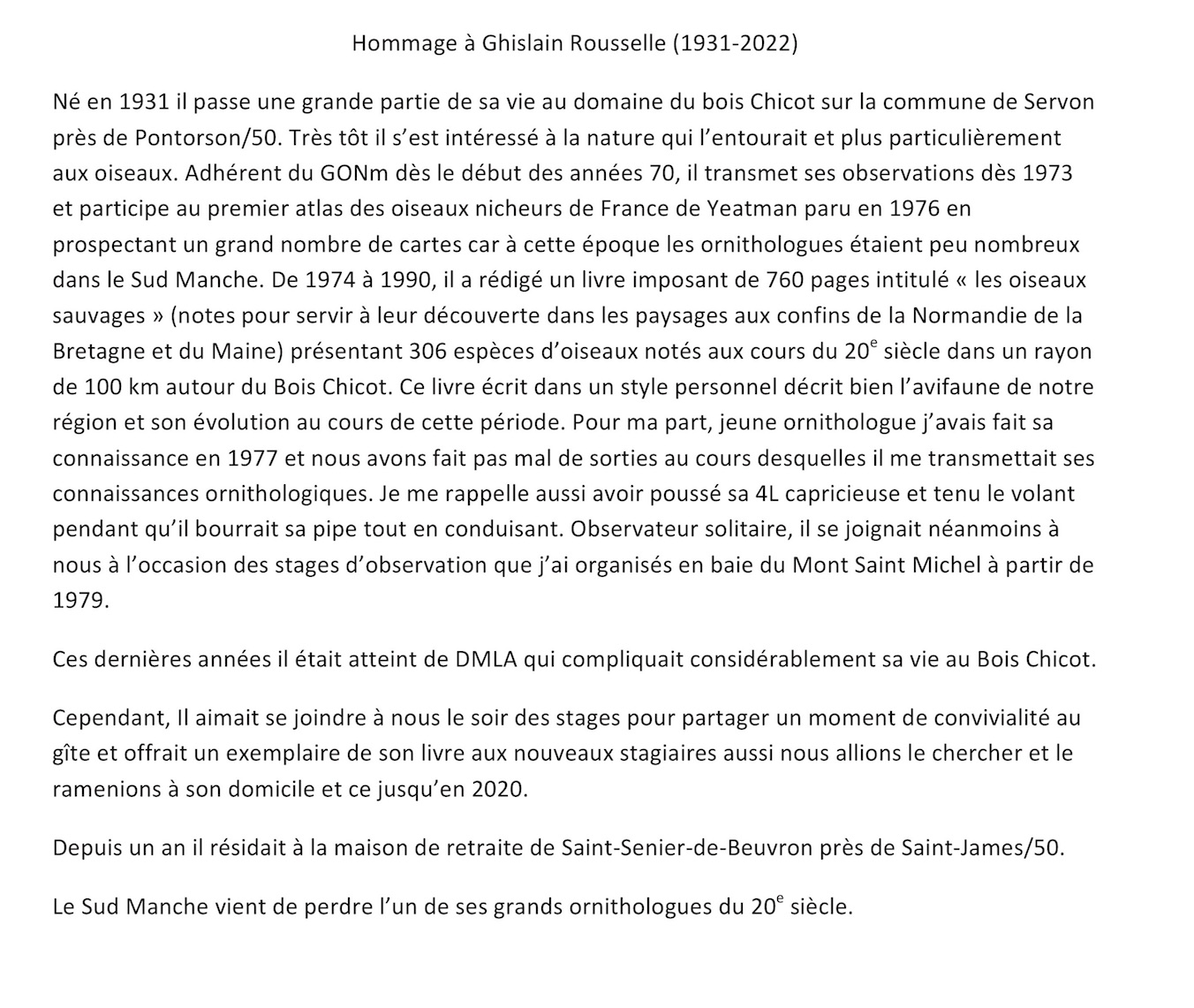 Il n'y a pas de rubrique nécrologique sur ce forum, simplement parce que lorsque l'un de nous décède, sa mémoire reste attachée à la vie archivée de l'association. C'est le cas de Monsieur Rousselle. Il résidait à Servon, dans une région de prairies humides dont il connaissait bien l'avifaune avant leur "mise en valeur" agricole .