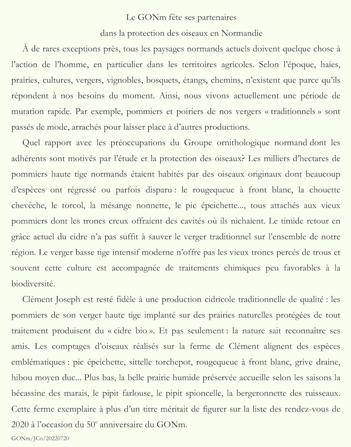 Producteur de cidre bio à partir d'un verger traditionnel haute tige, Clément Joseph défend un habitat régional original, et les oiseaux attachés aux vieux pommiers. Les rencontres proposées au cours de cette année particulière pour le GONm sont l'occasion de mettre en lumière le travail de ces cidriculteurs normands.